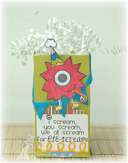I also used the Curly Border Die as well as the Pennant Border Die on this box. The monster was colored with Copic markers, cut out and mounted on the box with foam tape. The sentiment was stamped on white cardstock and then die cut using the Frame It Up 3 Die. I added some white filler to the box and it's ready for a little treat!!